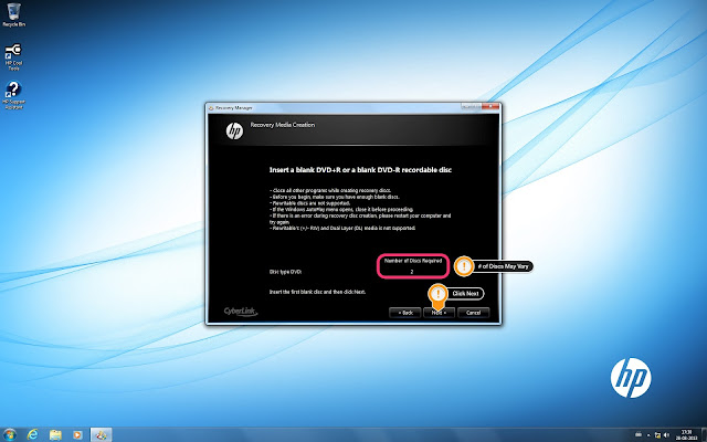 DVD must be DVD-R , You need approximately 4 blank DVD+R discs.(May vary) The Recovery Media Creation software program states how many discs are needed at the beginning of the process.Click next