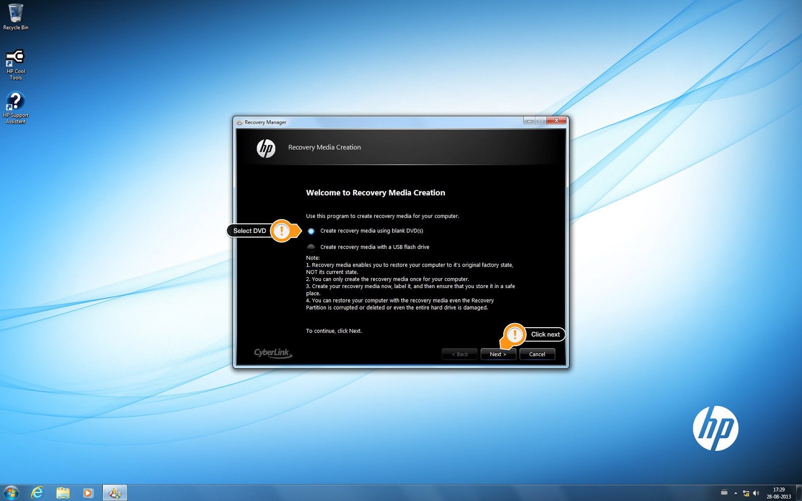 NOTE:If Recovery Media Creation or Recovery Disc Creation is not available (grayed out), then a recovery image has already been created. Due to license restrictions, only one set of recovery media can be created. Any new recovery media must be ordered online or obtained using another method.