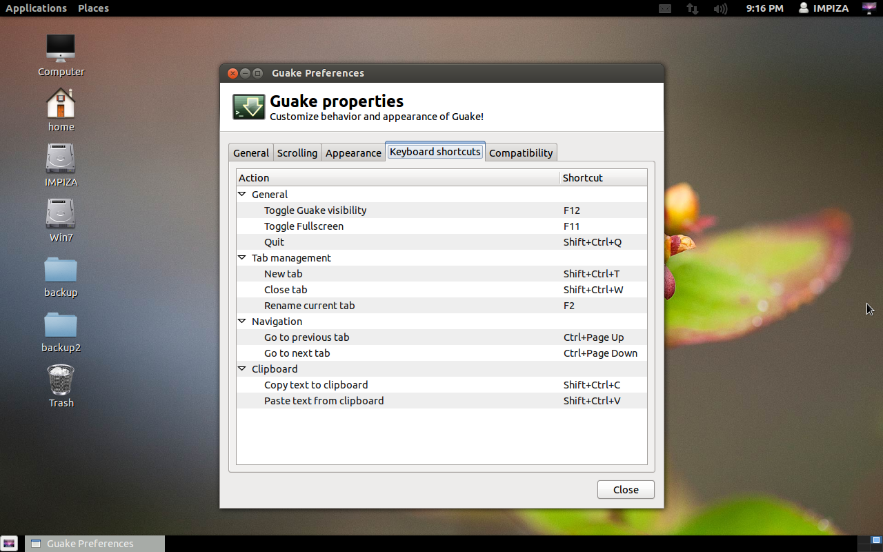 Guake terminal Properties (Keyboard Shortcuts)